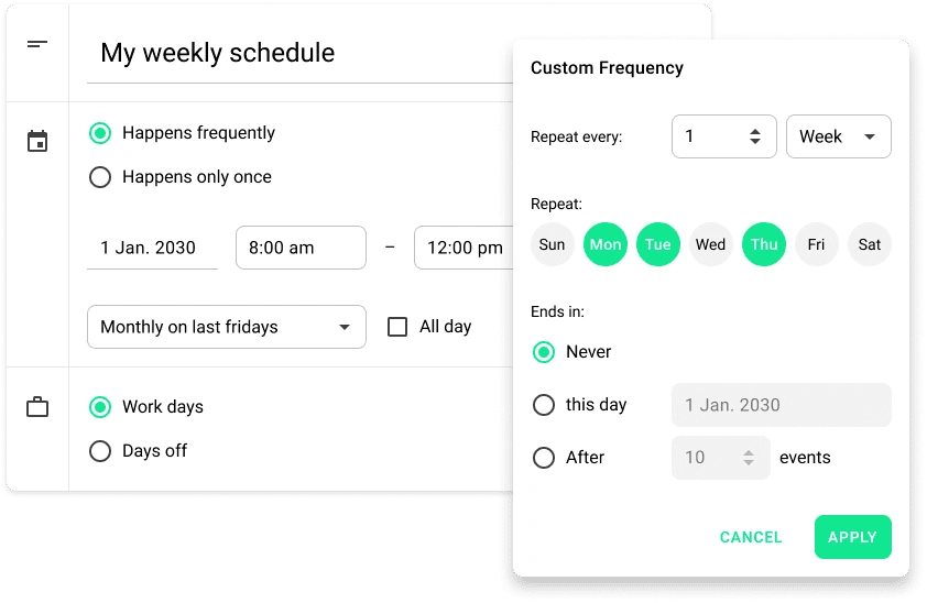 Create basic calendar rules in the back office to set up your company’s availability choices.